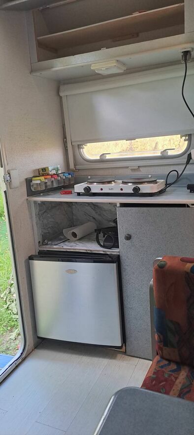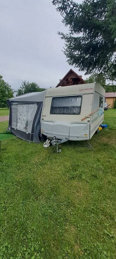 Przyczepa znajduje sie na działce gm. Rzgow pow. koniński. Możliwość umowienia sie na oglądanie dla zainteresowanych w ustalony wekend (przyczepa jest na działce 130 km od mojego miejsca zamieszkania) . Wnętrze suche , bez zapachów, nie było nic gotowane w środku. Instalacja gazowa została usunięta. Wszystko jest na prąd. Usunąłem także zlew w t.zw. kuchni. Przyczepa zimowana pod pokrowcem. Kuchenka elektryczna. W instalacji 12v brak akumulatora zelowego był 80Ah. Cena 8500zł.